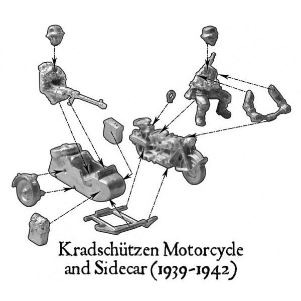 The Kradschutzen Motorcycle & Sidecar will add a little extra speed and maneuverability to your Bolt Action Afrika Korps force.