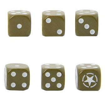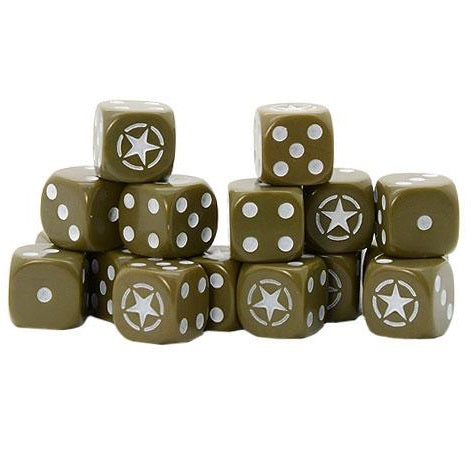 The Allied Star D6 Dice Pack contains 16 olive drab dice, with the famous Allies Star symbol replacing the 6!