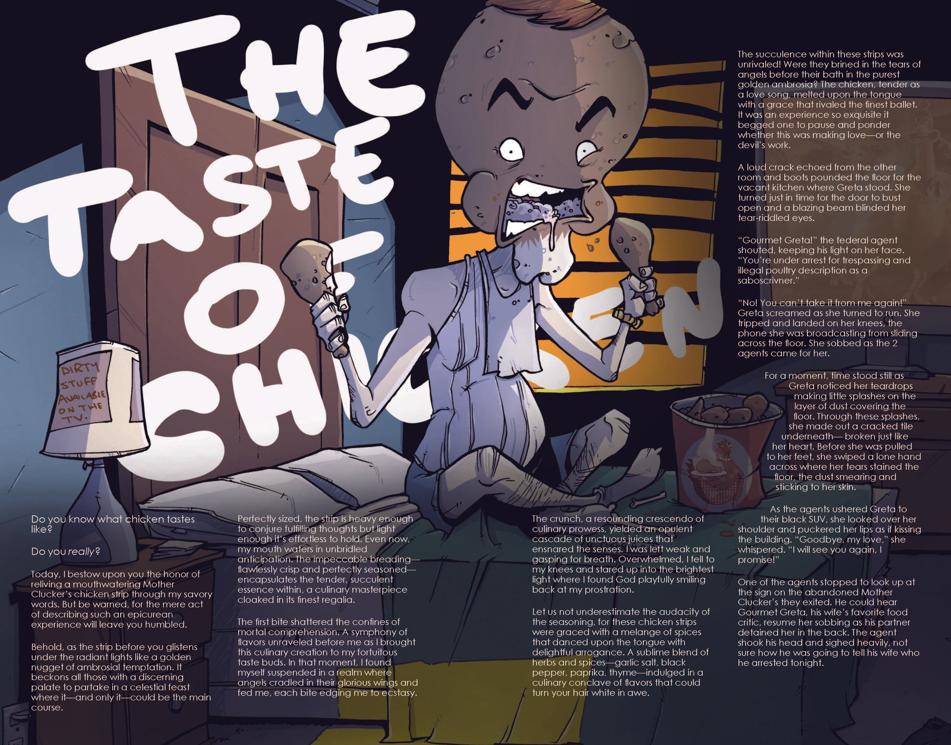 CHEW is the serialized TV show you wish you were bingeing every time you give up and throw on Parks and Rec reruns. The formula of a few parts gross cannibals-against-crime, a few parts absorbed memories, and a cast of zany lovable characters is pure CHEW."