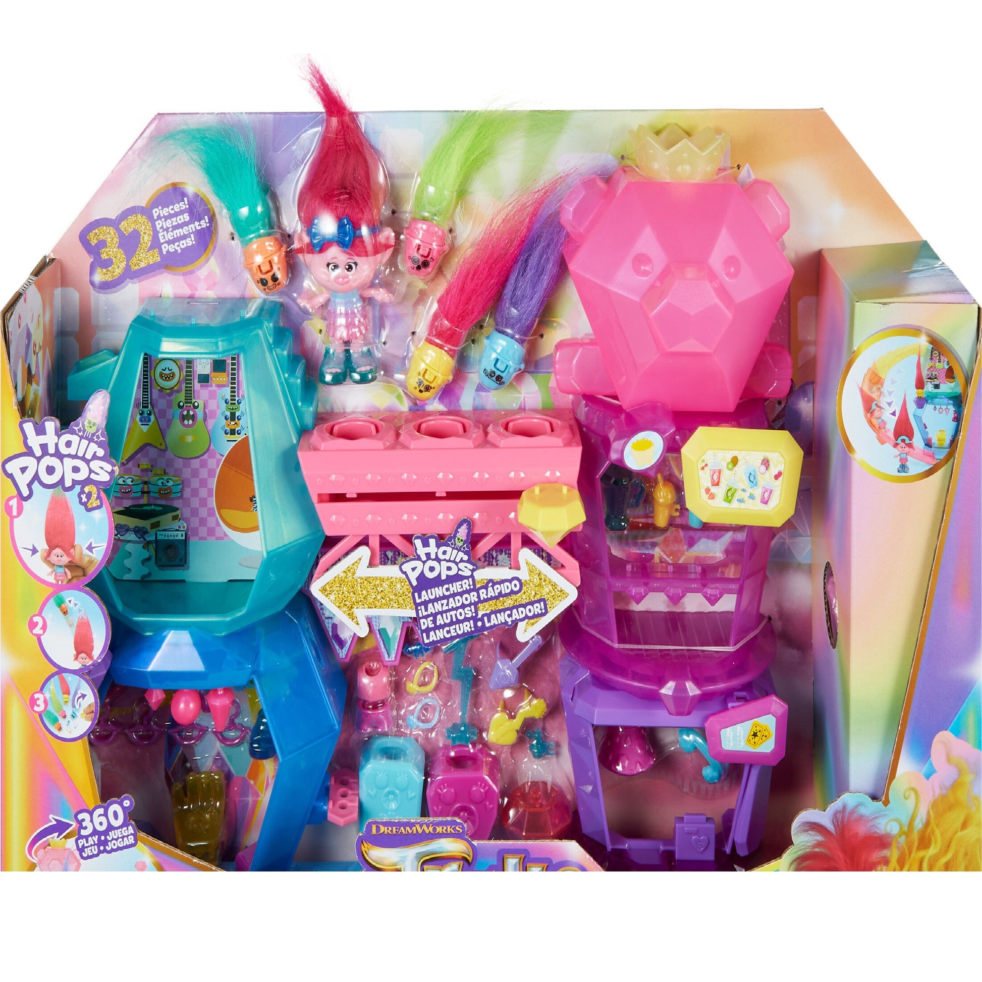 Inspired by the iconic location from DreamWorks Trolls Band Together, set offers two stories with a removable slide and other multiple areas of play, like a snack bar, dressing room, and stage. A Hair Pops launcher adds more happiness to playtime -- kids simply slide the gem across the bridge to see the Hair Pops fly!
