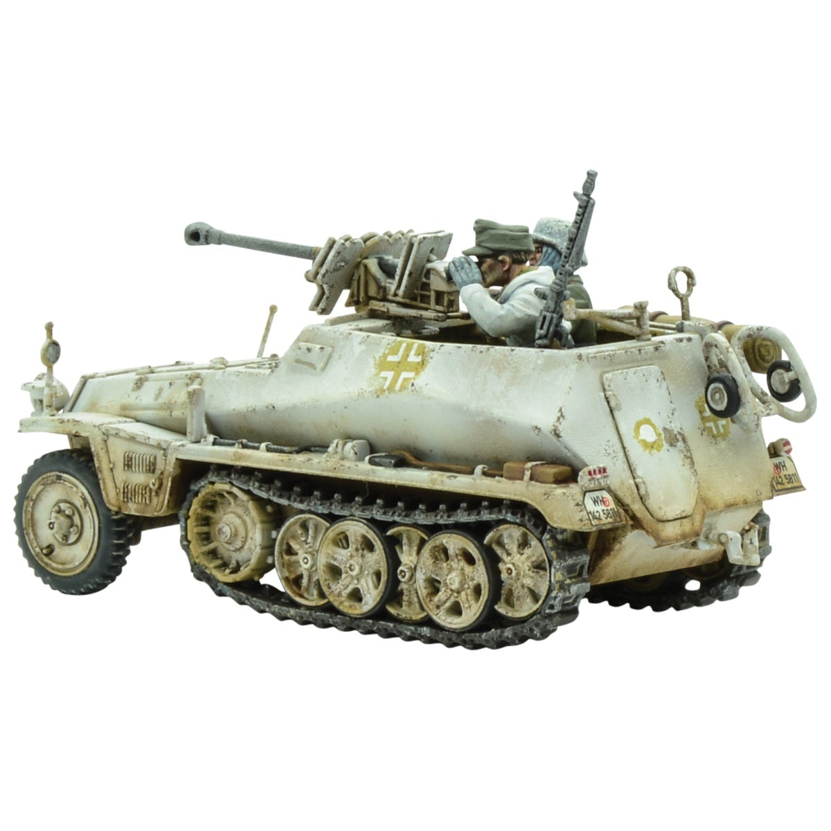The German Sd.Kfz 250 Half-Track was a reconnaissance and transport half-track mainly used by scout and HQ units. The vehicle was a shortened version of the ubiquitous Sd.Kfz 251 Hanomag series and much like its longer cousin there were many variants fulfilling different roles, such as cable carriers, ammunition carriers and radio carriers, amongst others. It carried six men including the driver and the co-driver and was armed with two pintle-mounted MG34 machine guns, one shielded forward facing and the other covering the rear and air.