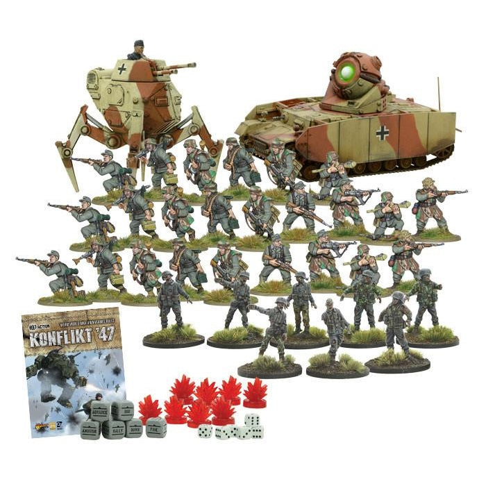 Continue the fight beyond 1945, with the Konflikt '47 German Starter Army Set! It features everything a would player need to field their first German army to take to the front.