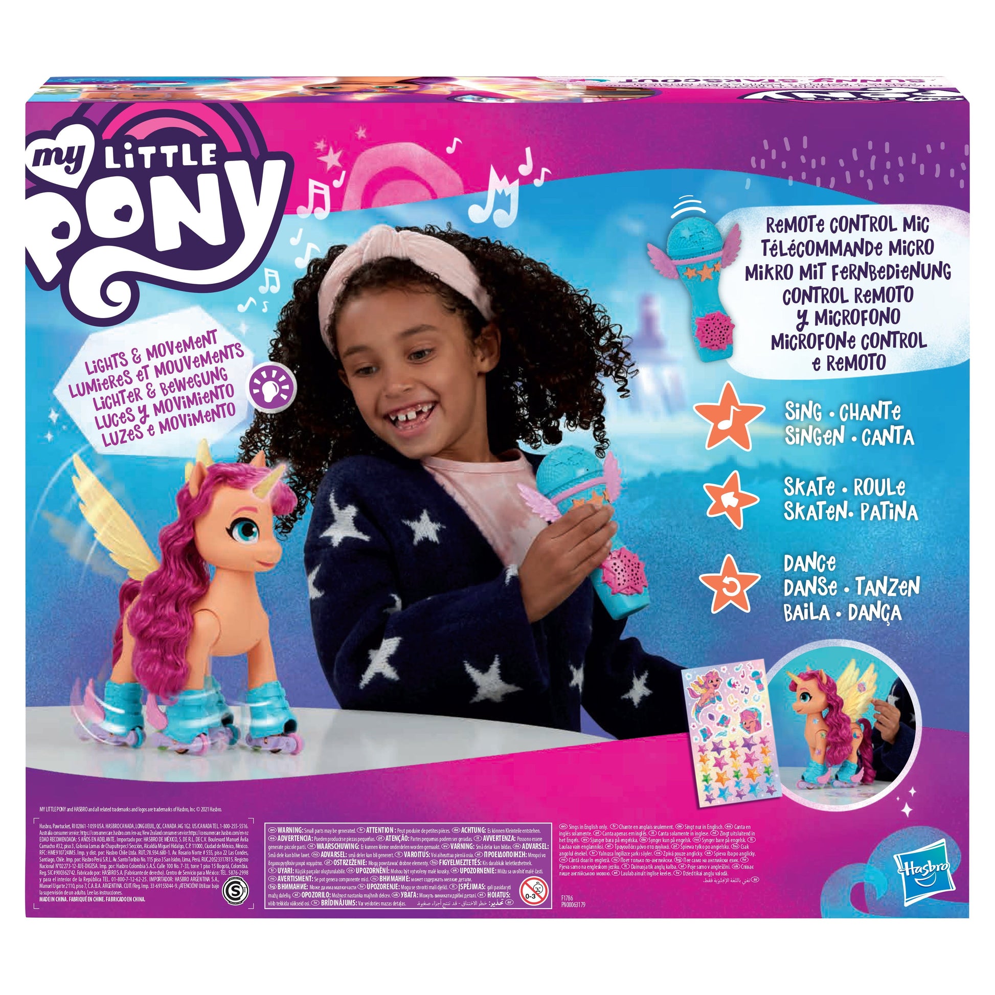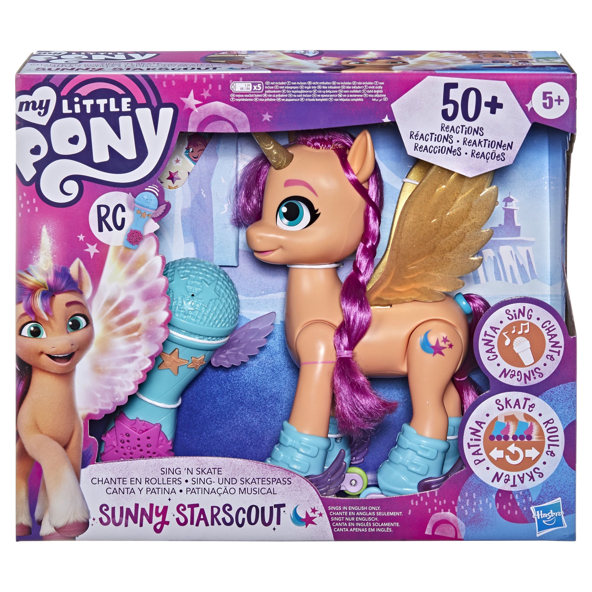 Sing 'N Skate Sunny Starscout is an interactive pony figure that kids can control. Use the buttons on the microphone to move the figure forward or spin her around. Kids can also shake the RC microphone to make the figure move! Figure moves her heads and wings while she skates and sings part of the song "Gonna Be My Day."