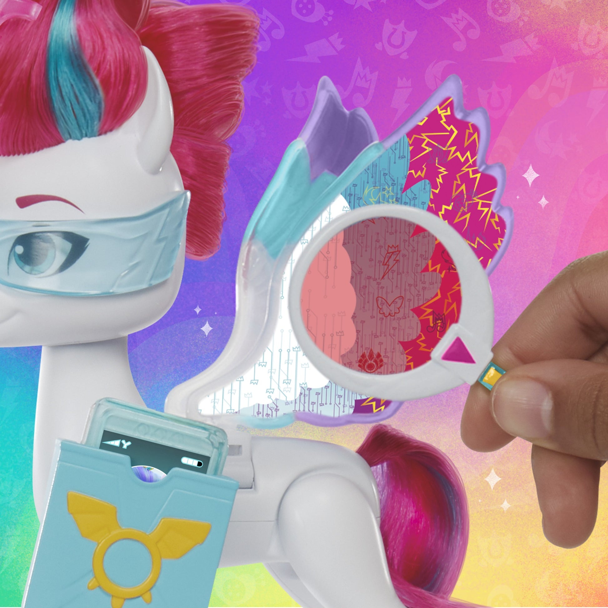 Discover magical secrets with the My Little Pony Wing Surprise Zipp Storm Set! Zipp is a rebellious princess who loves investigating mysteries in the My Little Pony: Make Your Mark show. Squeeze the figure's back legs to make her wings flap and reveal surprise colors on one side. Then, hold the magnifying glass decoder accessory over Zipp's wings to discover hidden Cutie Mark designs!