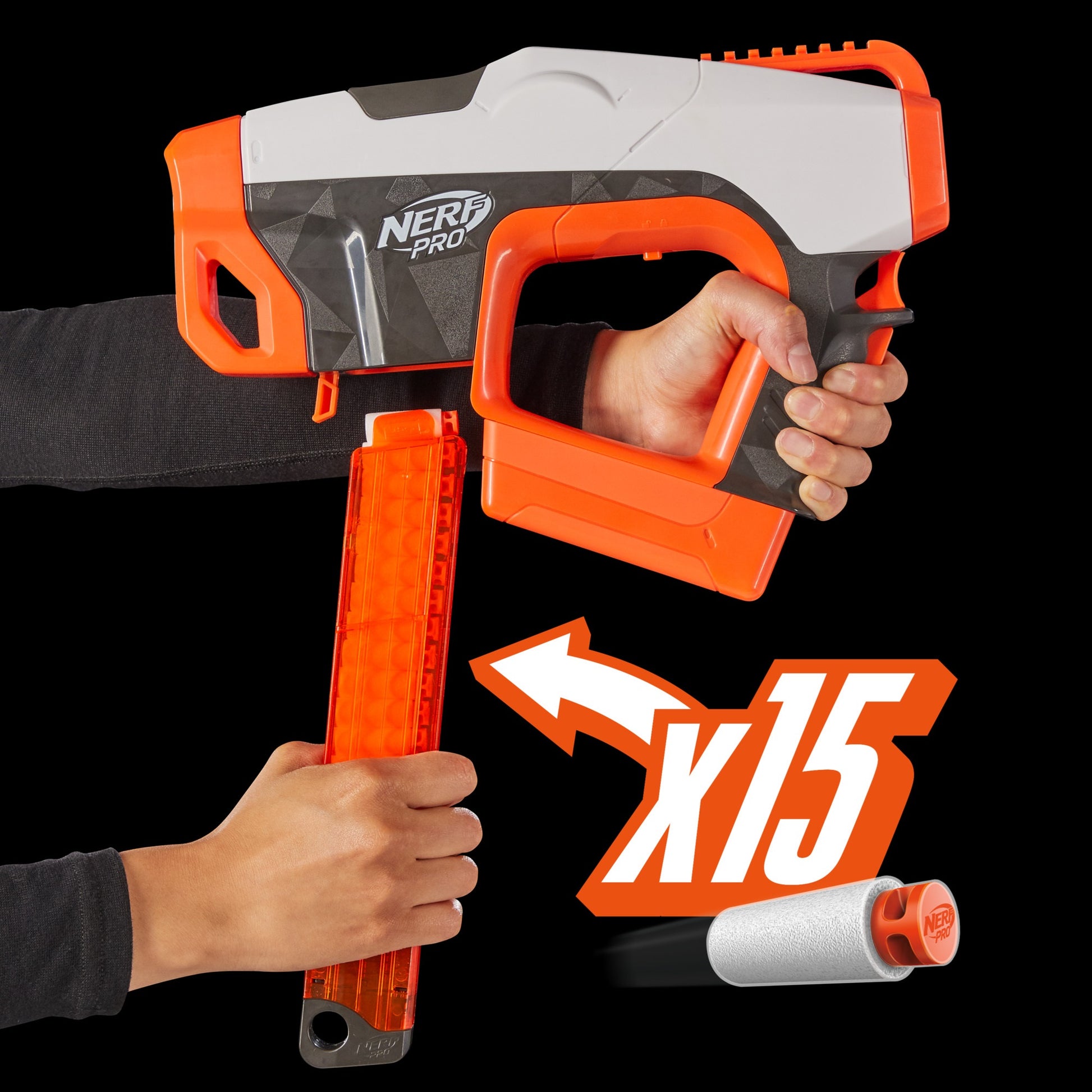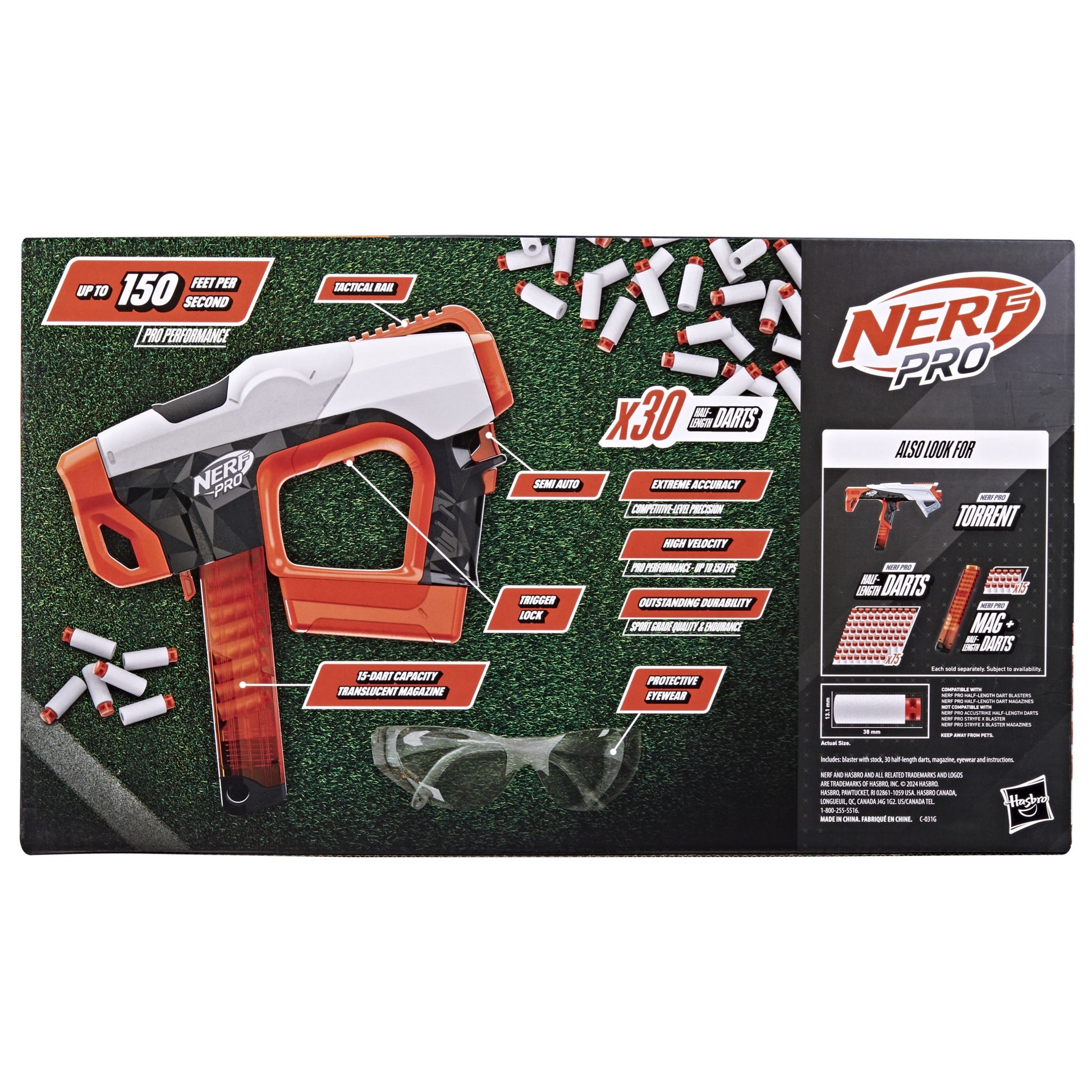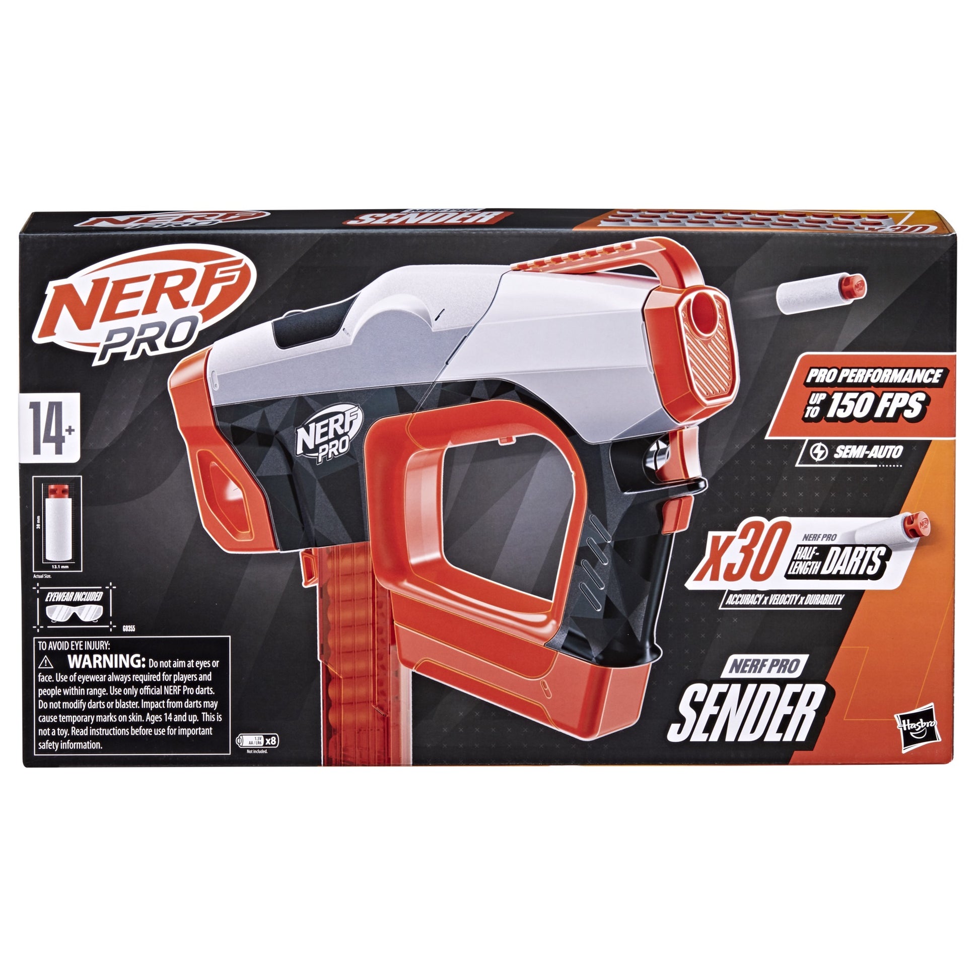 The Sender Blaster fires darts at a velocity of up to 150 feet per second with SEMI AUTO BLASTING: Power up the blaster for motorized semi automatic dart blasting. Requires 8x 1.5v AA alkaline batteries (not included). Nerf Pro half-length darts are designed for extreme accuracy, distance, and velocity, and the shorter length provides a more stable trajectory and greater precision. The durable, quick-release magazine is compact and lightweight for convenient portability.